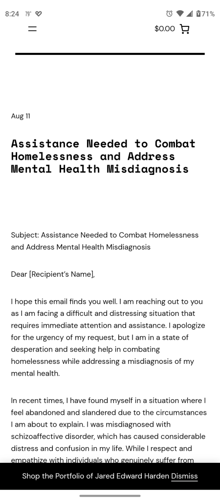 I hope this email finds you well. I am reaching out to you as I am facing a difficult and distressing situation that requires immediate attention and assistance. I apologize for the urgency of my request, but I am in a state of desperation and seeking help in combating homelessness while addressing a misdiagnosis of my mental health.