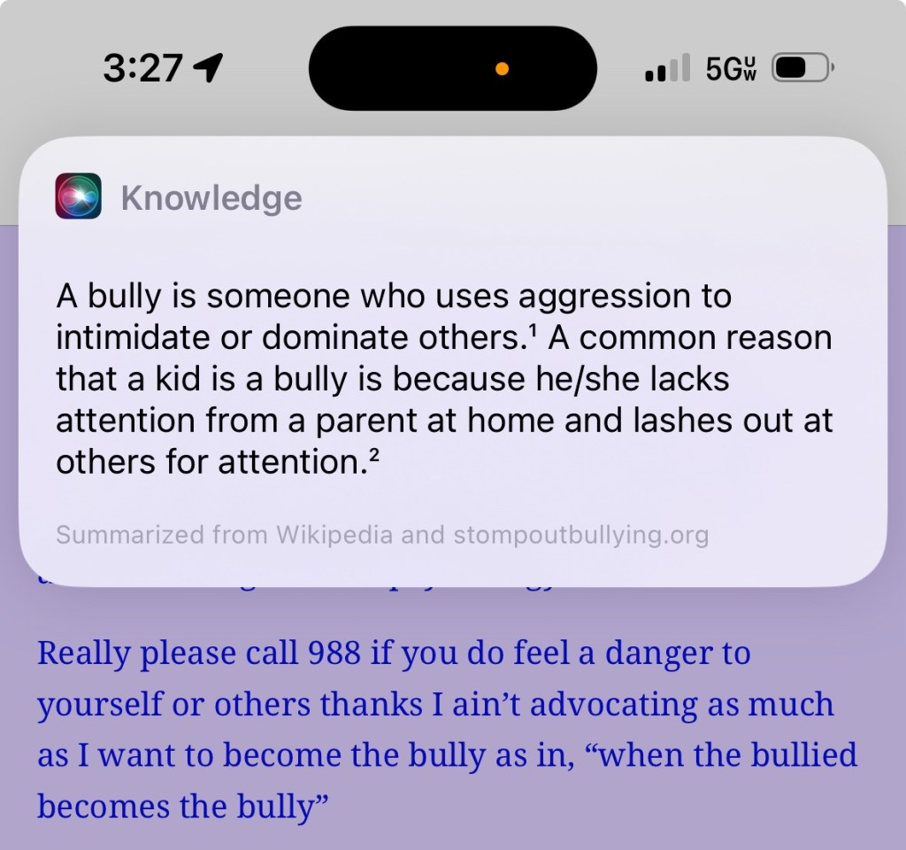 Really please call 988 if you do feel a danger to yourself or others thanks I ain’t advocating as much as I want to become the bully as in, “when the bullied becomes the bully”